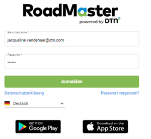 Gehen Sie nach roadmaster.dtn.com Geben Sie Benutzername und Passwort ein (wie per E-mail erhalten) Wahlen Sie die Sprache (Dies muss nur einmal durchgeführt werden) Klicken Sie Anmelden