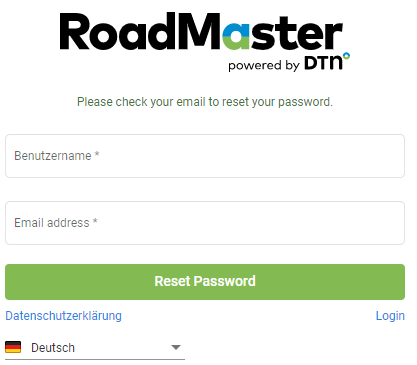 - Ihr neues Passwort wurde an Ihre E-Mail-Adresse gesendet. Sie können sich nun mit Ihrem neuen Passwort bei RoadMaster anmelden.