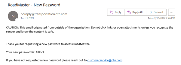 - Sobald RoadMaster Ihre Anmeldedaten bestätigt hat, erhalten Sie eine weitere E-Mail von DTN/RoadMaster. Diese E-Mail enthält Ihr neues Passwort.